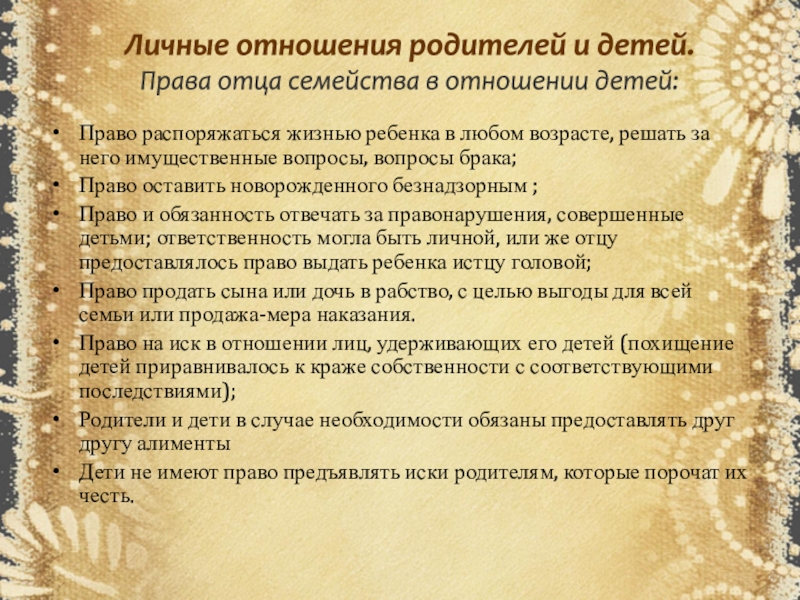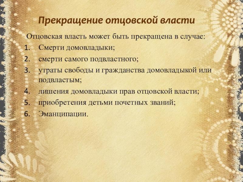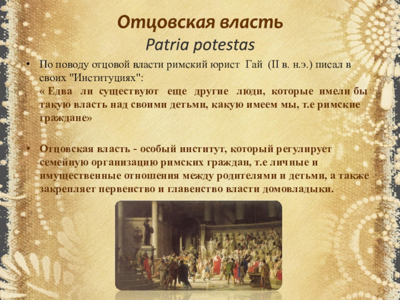 Отцовская власть - особый институт, который регулирует семейную организацию римских граждан, т.е личные и имущественные отношения между родителями и детьми, а также закрепляет первенство и главенство власти домовладыки.