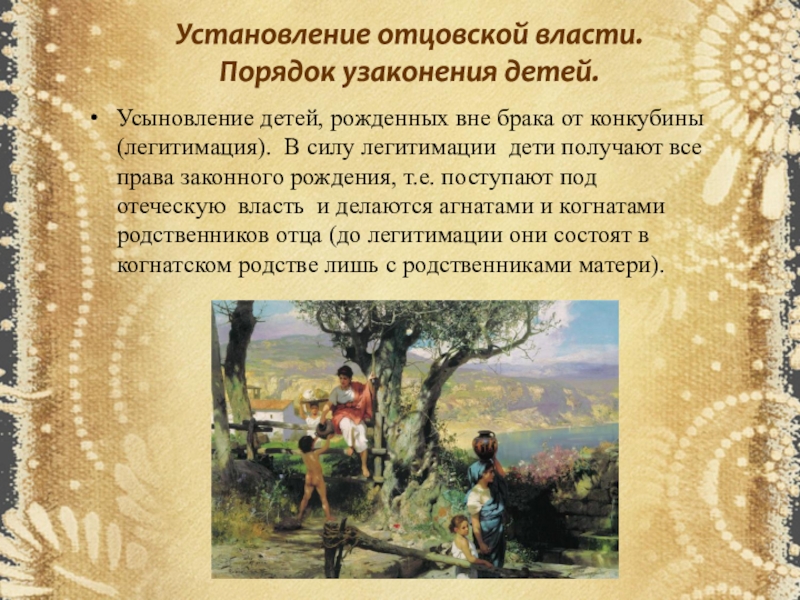 рождения, т.е. поступают под отеческую власть и делаются агнатами и когнатами родственников отца (до легитимации они состоят в когнатском родстве лишь с родственниками матери).