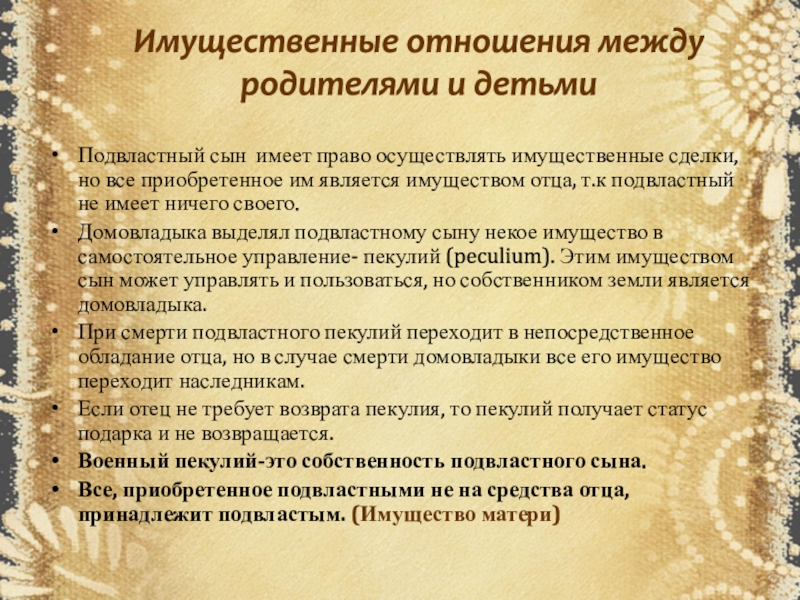 Домовладыка выделял подвластному сыну некое имущество в самостоятельное управление- пекулий (peculium). Этим имуществом сын может управлять и пользоваться, но собственником земли является домовладыка.
