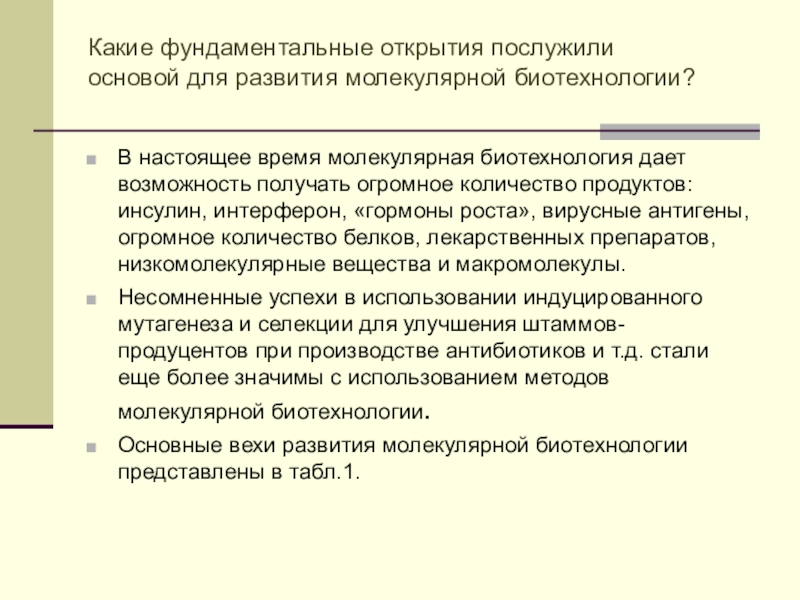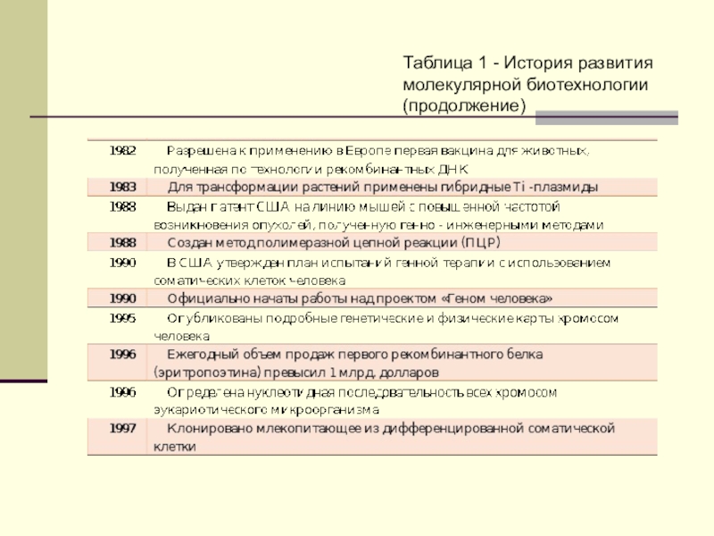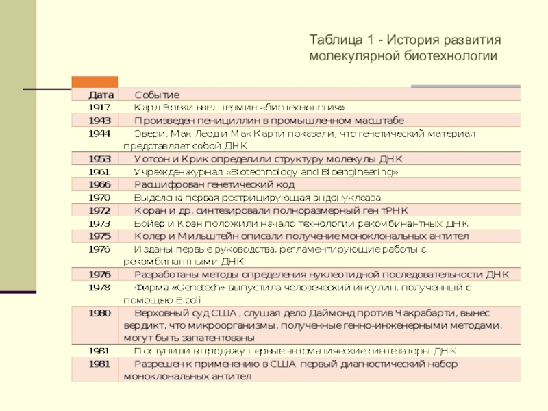 Основные вехи развития молекулярной биотехнологии представлены в табл.1.