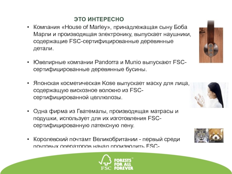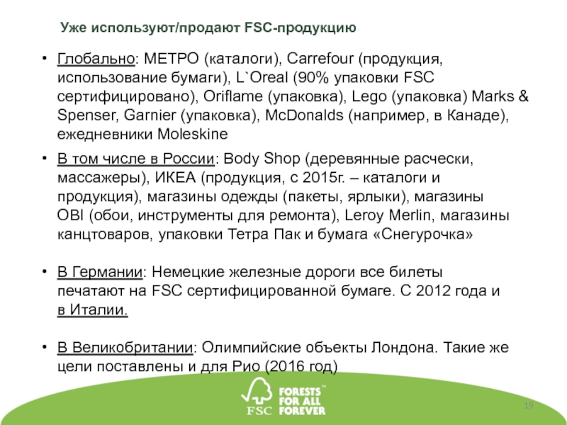 В том числе в России: Body Shop (деревянные расчески, массажеры), ИКЕА (продукция, с 2015г. – каталоги и продукция), магазины одежды (пакеты, ярлыки), магазины OBI (обои, инструменты для ремонта), Leroy Merlin, магазины канцтоваров, упаковки Тетра Пак и бумага «Снегурочка»