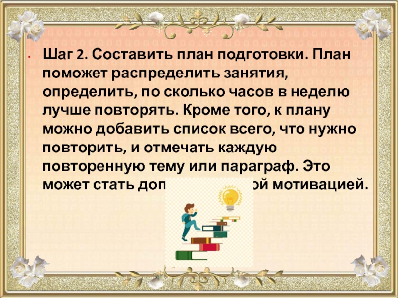 Слайд 7Шаг 2. Составить план подготовки. План поможет распределить занятия, определить,