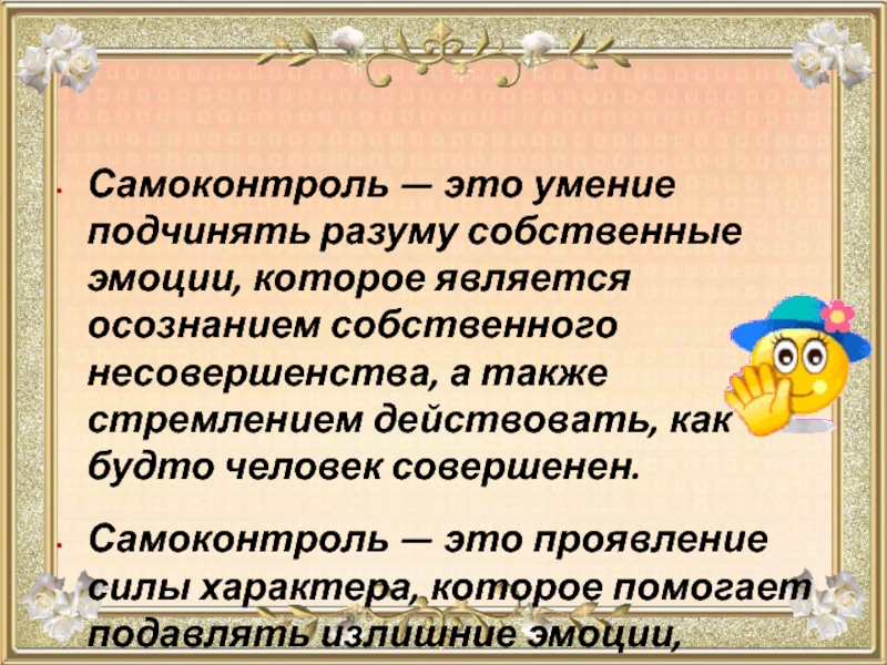Слайд 5Самоконтроль — это умение подчинять разуму собственные эмоции, которое является