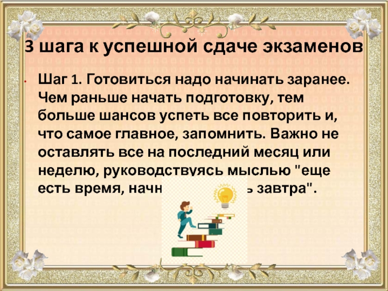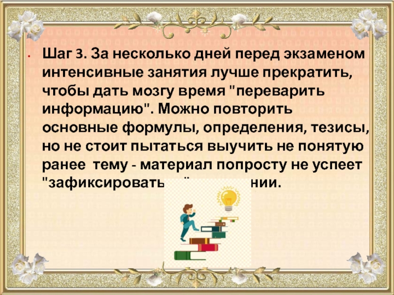 Слайд 8Шаг 3. За несколько дней перед экзаменом интенсивные занятия лучше