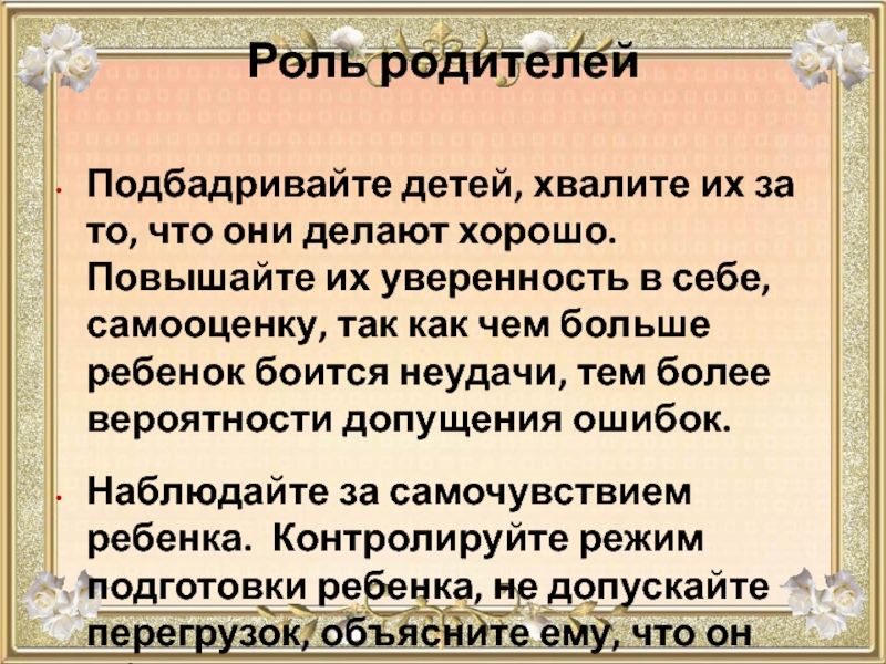 Наблюдайте за самочувствием ребенка. Контролируйте режим подготовки ребенка, не допускайте перегрузок, объясните ему, что он обязательно должен чередовать занятия с отдыхом.