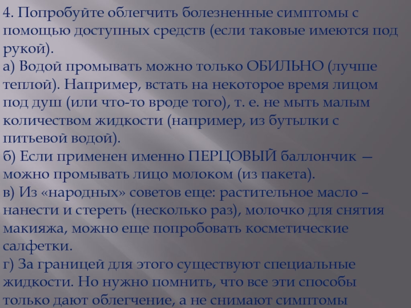 г) За границей для этого существуют специальные жидкости. Но нужно помнить, что все эти способы только дают облегчение, а не снимают симптомы полностью. Симптомы сами полностью проходят через некоторое время!