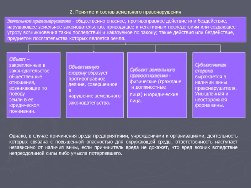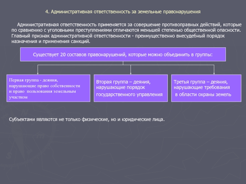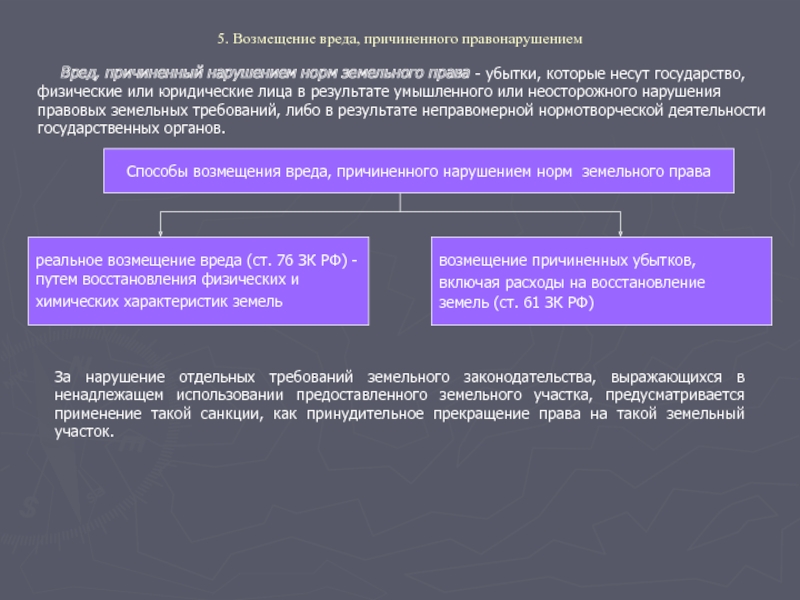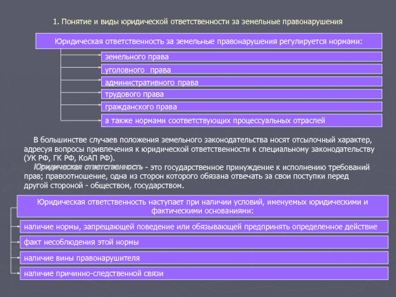 В большинстве случаев положения земельного законодательства носят отсылочный характер, адресуя вопросы привлечения к юридической ответственности к специальному законодательству (УК РФ, ГК РФ, КоАП РФ).