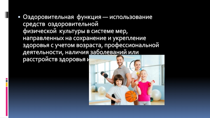 Слайд 4Оздоровительная  функция — использование средств  оздоровительной   физической  культуры в