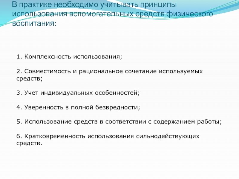 Слайд 15В практике необходимо учитывать принципы использования вспомогательных средств физического воспитания: