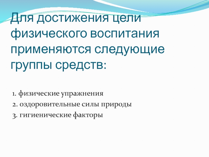 Слайд 4Для достижения цели физического воспитания применяются следующие группы средств: