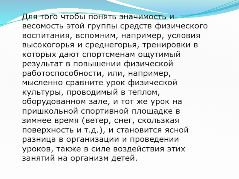 которых дают спортсменам ощутимый результат в повышении физической работоспособности, или, например, мысленно сравните урок физической культуры, проводимый в теплом, оборудованном зале, и тот же урок на пришкольной спортивной площадке в зимнее время (ветер, снег, скользкая поверхность и т.д.), и становится ясной разница в организации и проведении уроков, также в силе воздействия этих занятий на организм детей.