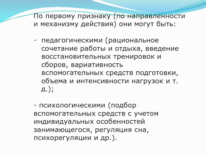 педагогическими (рациональное сочетание работы и отдыха, введение восстановительных тренировок и