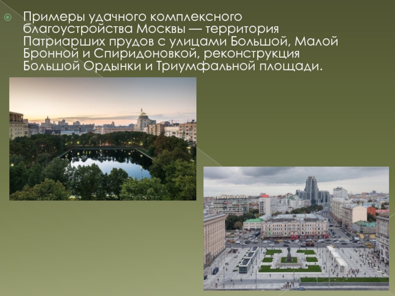 Слайд 6Примеры удачного комплексного благоустройства Москвы — территория Патриарших прудов с
