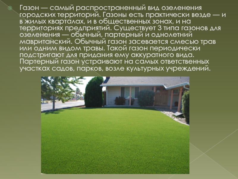 Слайд 13Газон — самый распространенный вид озеленения городских территорий. Газоны есть