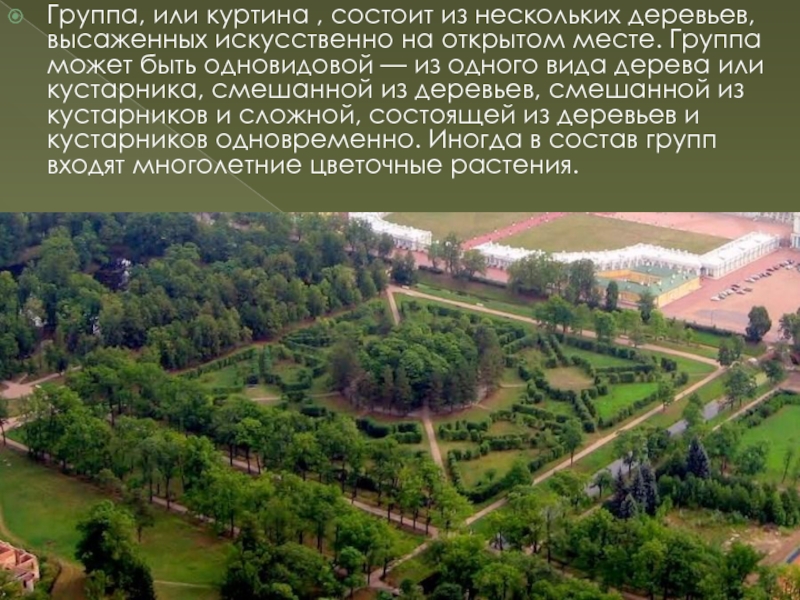 Слайд 10Группа, или куртина , состоит из нескольких деревьев, высаженных искусственно