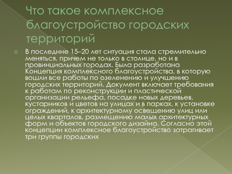 в провинциальных городах. Была разработана Концепция комплексного благоустройства, в которую вошли все работы по озеленению и улучшению городских территорий. Документ включает требования к работам по реконструкции и пластической организации рельефа, посадке новых деревьев, кустарников и цветов на улицах и в парках, к установке ограждений, к архитектурному освещению улиц или целых кварталов, размещению малых архитектурных форм и объектов городского дизайна. Согласно этой концепции комплексное благоустройство затрагивает три группы городских