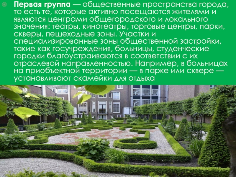 Слайд 3Первая группа — общественные пространства города, то есть те, которые