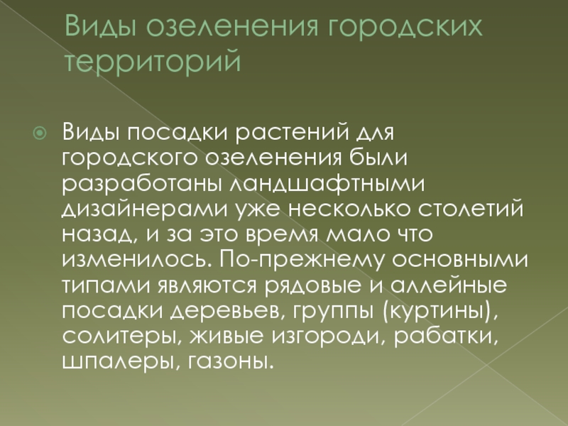 время мало что изменилось. По-прежнему основными типами являются рядовые и аллейные посадки деревьев, группы (куртины), солитеры, живые изгороди, рабатки, шпалеры, газоны.