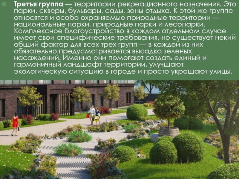 Слайд 5Третья группа — территории рекреационного назначения. Это парки, скверы, бульвары,