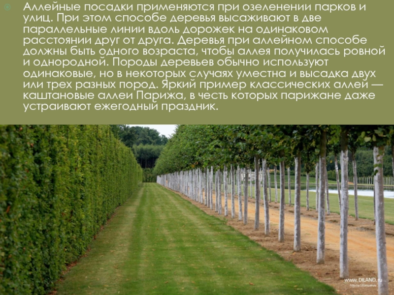 Слайд 8Аллейные посадки применяются при озеленении парков и улиц. При этом