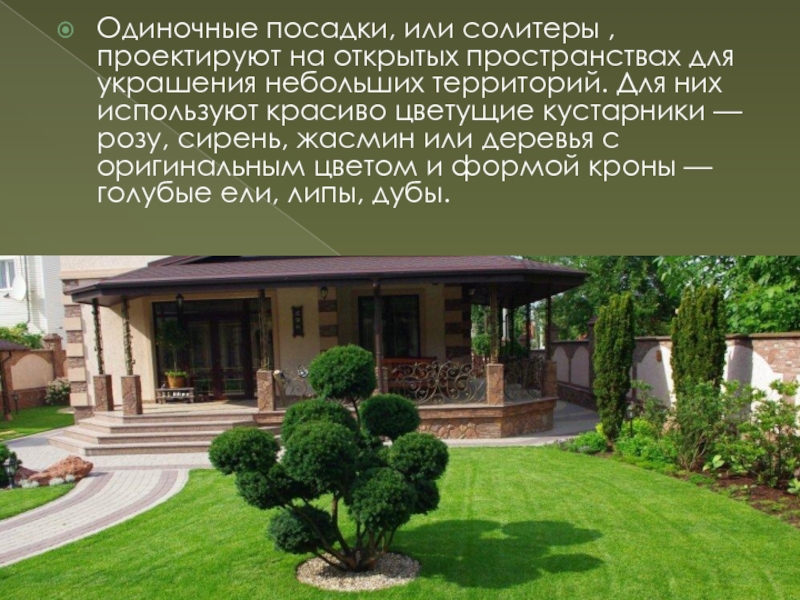 Слайд 11Одиночные посадки, или солитеры , проектируют на открытых пространствах для
