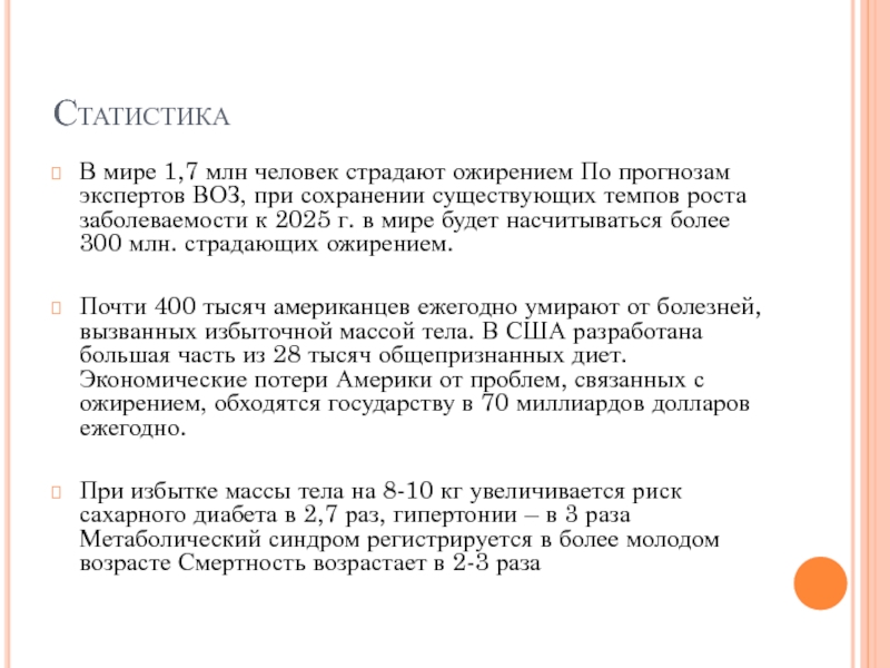 При избытке массы тела на 8-10 кг увеличивается риск сахарного диабета в 2,7 раз, гипертонии – в 3 раза Метаболический синдром регистрируется в более молодом возрасте Смертность возрастает в 2-3 раза