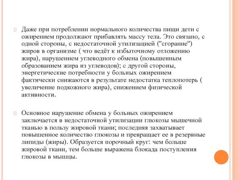 Слайд 7Даже при потреблении нормального количества пищи дети с ожирением продолжают
