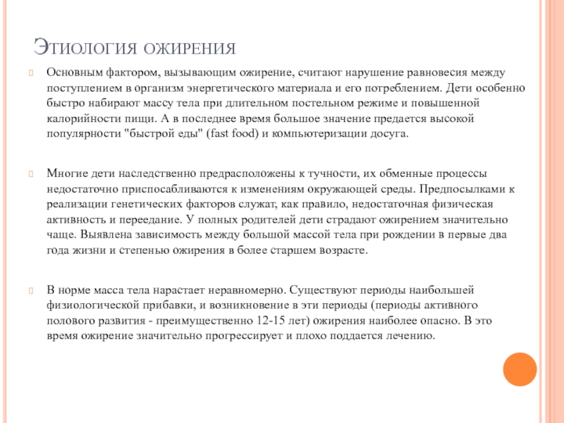 В норме масса тела нарастает неравномерно. Существуют периоды наибольшей физиологической прибавки, и возникновение в эти периоды (периоды активного полового развития - преимущественно 12-15 лет) ожирения наиболее опасно. В это время ожирение значительно прогрессирует и плохо поддается лечению.