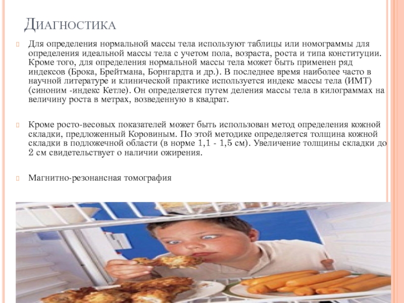 Кроме росто-весовых показателей может быть использован метод определения кожной складки, предложенный Коровиным. По этой методике определяется толщина кожной складки в подложечной области (в норме 1,1 - 1,5 см). Увеличение толщины складки до 2 см свидетельствует о наличии ожирения.