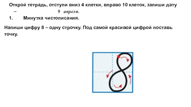 Слайд 3Открой тетрадь, отступи вниз 4 клетки, вправо 10 клеток, запиши