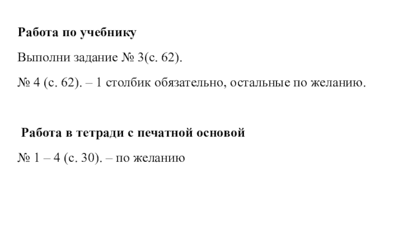 Работа по учебникуВыполни задание № 3(с. 62).№ 4 (с. 62). – 1 столбик обязательно, остальные по желанию.