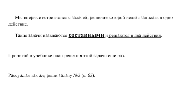 Мы впервые встретились с задачей, решение которой нельзя записать в одно действие. Такие задачи называются составными и