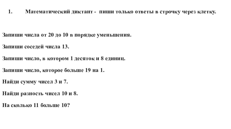 Слайд 41. Математический диктант - пиши только ответы в строчку через