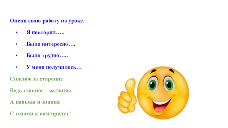Оцени свою работу на уроке.•   Я повторил…..•   Было интересно….•   Было трудно…..•