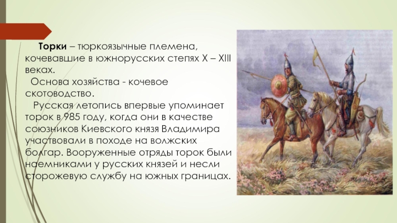Слайд 13   Торки – тюркоязычные племена, кочевавшие в южнорусских