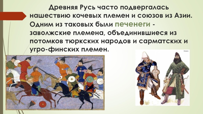 печенеги - заволжские племена, объединившиеся из потомков тюркских народов и сарматских и угро-финских племен.