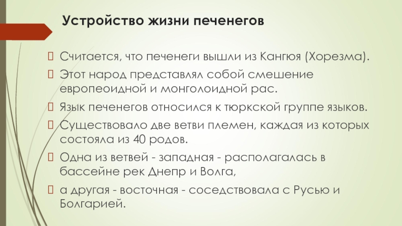 Считается, что печенеги вышли из Кангюя (Хорезма).