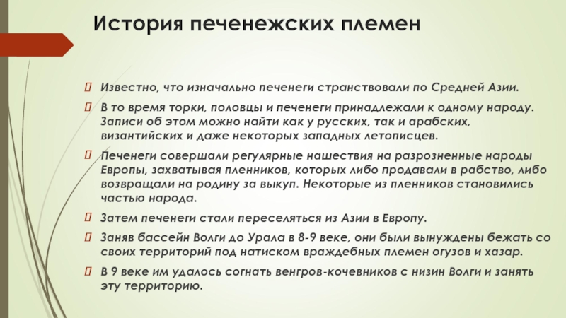 Известно, что изначально печенеги странствовали по Средней Азии.