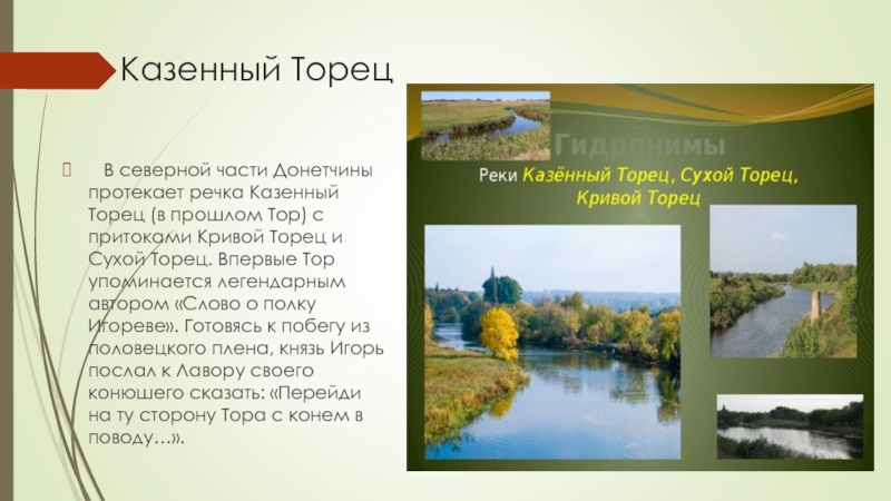 Торец. Впервые Тор упоминается легендарным автором «Слово о полку Игореве». Готовясь к побегу из половецкого плена, князь Игорь послал к Лавору своего конюшего сказать: «Перейди на ту сторону Тора с конем в поводу…».