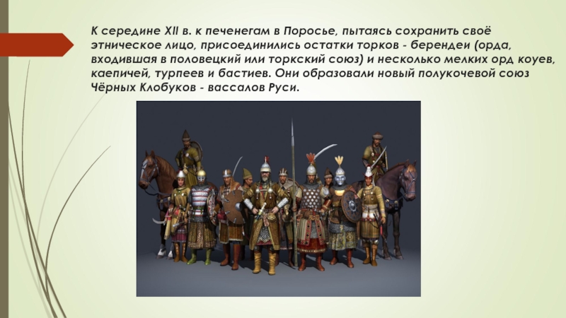 в половецкий или торкский союз) и несколько мелких орд коуев, каепичей, турпеев и бастиев. Они образовали новый полукочевой союз Чёрных Клобуков - вассалов Руси.