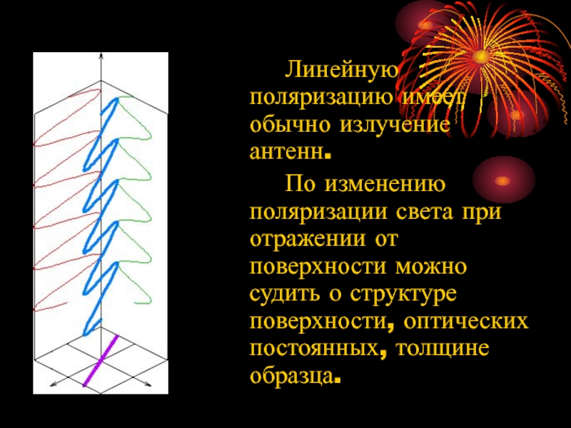 Линейную поляризацию имеет обычно излучение антенн.		По изменению поляризации света при отражении от поверхности можно судить о структуре