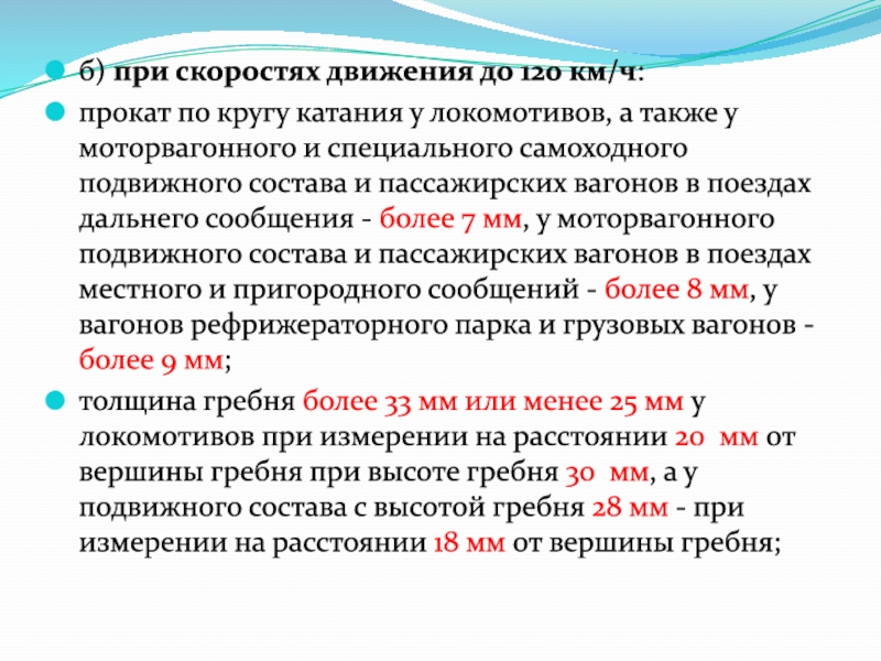 состава и пассажирских вагонов в поездах дальнего сообщения - более 7 мм, у моторвагонного подвижного состава и пассажирских вагонов в поездах местного и пригородного сообщений - более 8 мм, у вагонов рефрижераторного парка и грузовых вагонов - более 9 мм;