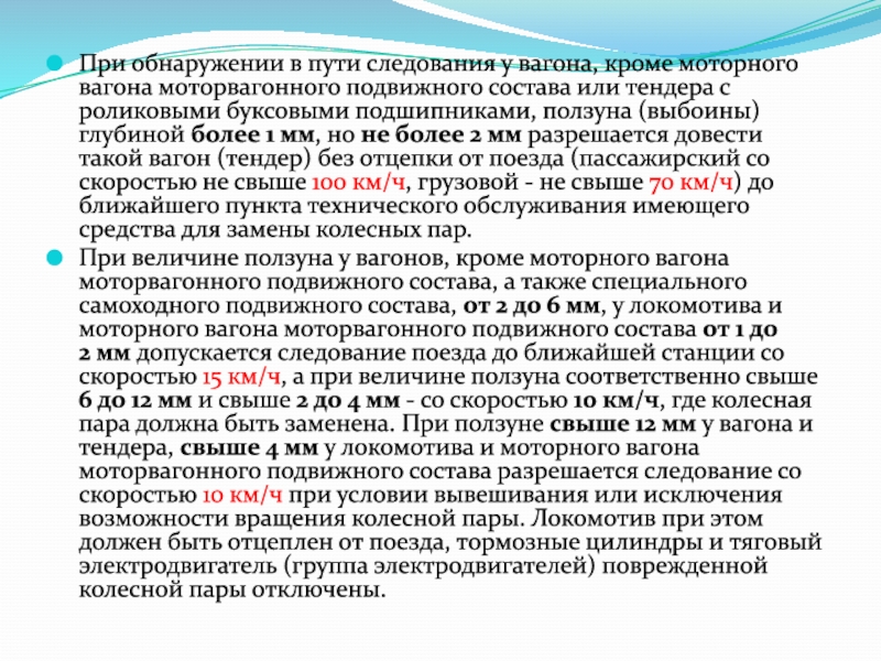При величине ползуна у вагонов, кроме моторного вагона моторвагонного подвижного состава, а также специального самоходного подвижного состава, от 2 до 6 мм, у локомотива и моторного вагона моторвагонного подвижного состава от 1 до 2 мм допускается следование поезда до ближайшей станции со скоростью 15 км/ч, а при величине ползуна соответственно свыше 6 до 12 мм и свыше 2 до 4 мм - со скоростью 10 км/ч, где колесная пара должна быть заменена. При ползуне свыше 12 мм у вагона и тендера, свыше 4 мм у локомотива и моторного вагона моторвагонного подвижного состава разрешается следование со скоростью 10 км/ч при условии вывешивания или исключения возможности вращения колесной пары. Локомотив при этом должен быть отцеплен от поезда, тормозные цилиндры и тяговый электродвигатель (группа электродвигателей) поврежденной колесной пары отключены.