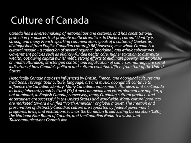 Historically Canada has been influenced by British, French, and aboriginal cultures and traditions. Through their culture, language, art and music, aboriginals continue to influence the Canadian identity. Many Canadians value multiculturalism and see Canada as being inherently multicultural.[61] American media and entertainment are popular, if not dominant, in English Canada; conversely, many Canadian cultural products and entertainers are successful in the United States and worldwide. Many cultural products are marketed toward a unified "North American" or global market. The creation and preservation of distinctly Canadian culture are supported by federal government programs, laws, and institutions such as the Canadian Broadcasting Corporation (CBC), the National Film Board of Canada, and the Canadian Radio-television and Telecommunications Commission.