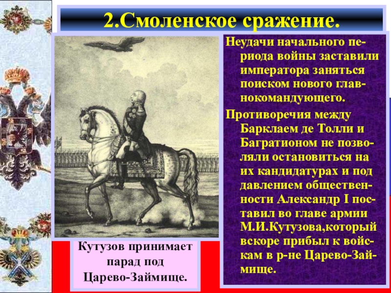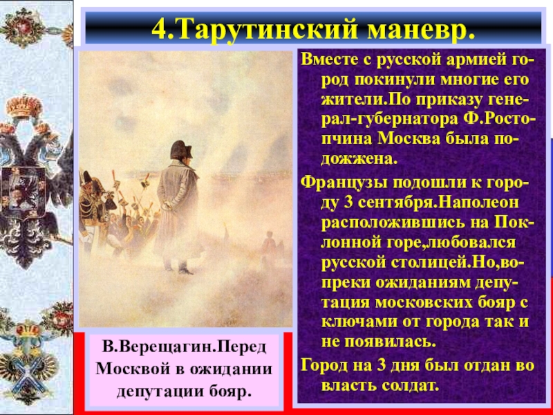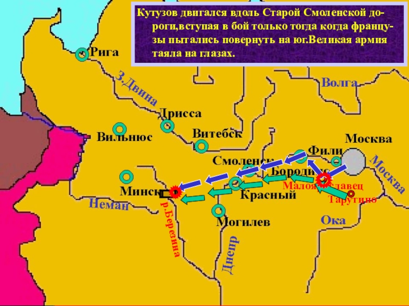 Кутузов двигался вдоль Старой Смоленской до- роги,вступая в бой только тогда когда францу-зы пытались повернуть на юг.Великая армия таяла на глазах.