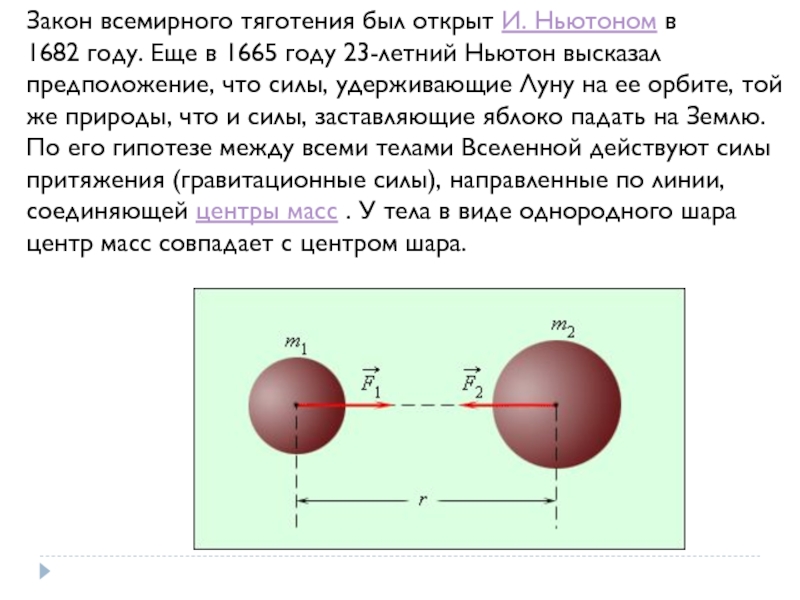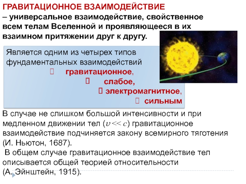 В случае не слишком большой интенсивности и при медленном движении тел (v << c) гравитационное взаимодействие подчиняется закону всемирного тяготения (И. Ньютон, 1687).