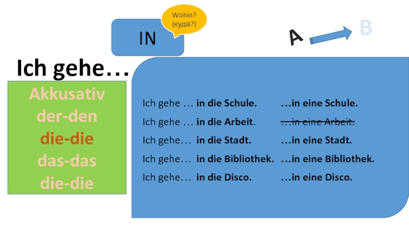Ich gehe… in die Bibliothek. …in eine Bibliothek.