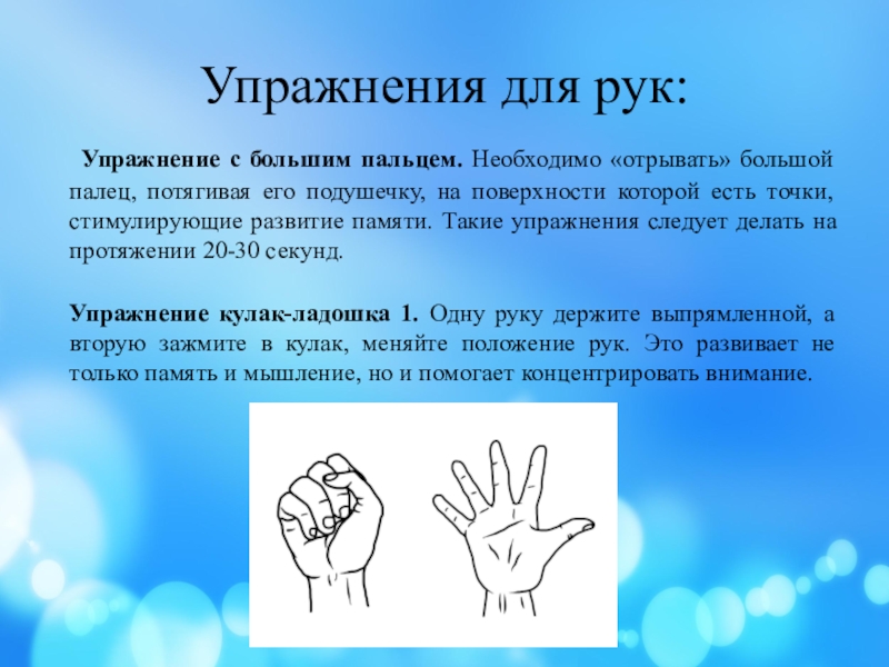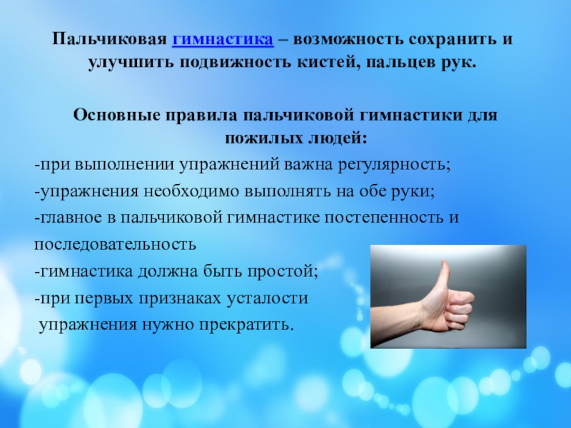 Именно поэтому упражнения для улучшения двигательной активности рук (кистей, пальцев) важно выполнять не только в детском, но и в пожилом возрасте.