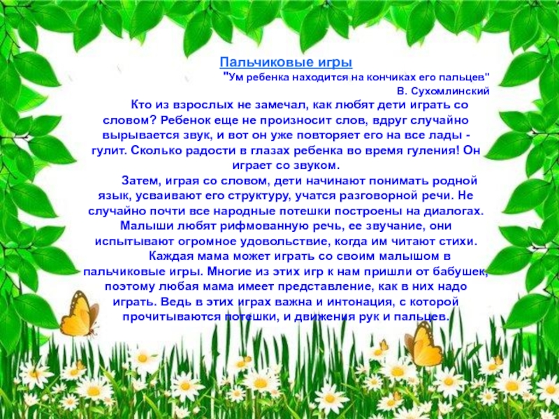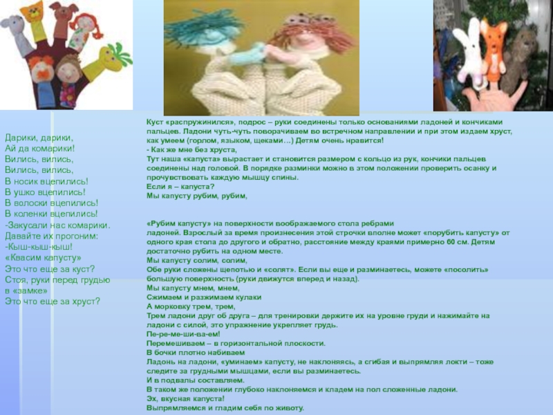 Куст «распружинился», подрос – руки соединены только основаниями ладоней и кончиками пальцев. Ладони чуть-чуть поворачиваем во встречном направлении и при этом издаем хруст, как умеем (горлом, языком, щеками…) Детям очень нравится!