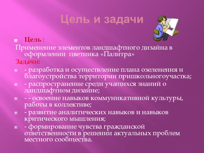 - распространение среди учащихся знаний о ландшафтном дизайне;